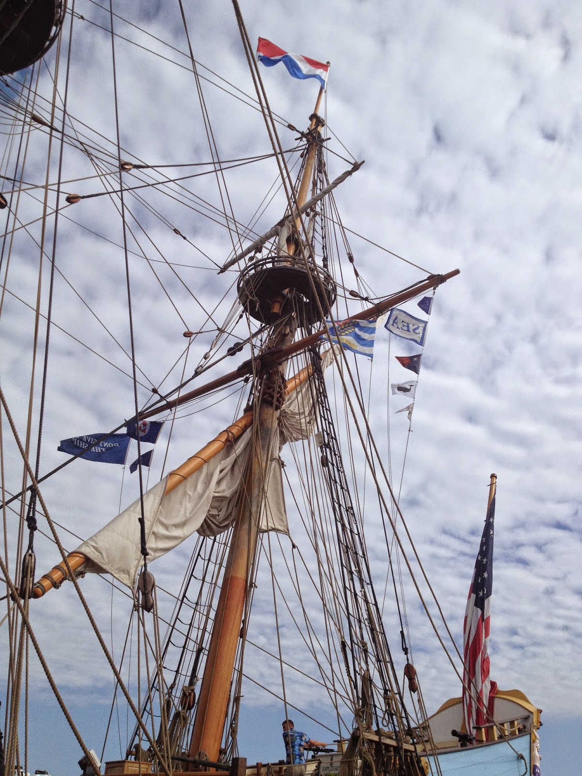 Ok, so the high seas turn out to be Delaware Bay on a replica of the Kalmar Nyckel, the first ship from Sweden coming to the new world and bringing with it a load of colonists who founded New Sweden in what is now Wilmington, Delaware. The replica makes two trips a day out on to the Bay and one of them is a pirate voyage. The crew dresses as pirates and leads the passengers in sea shanties and stories of piracy. Granted, it’s geared more toward children, but Keith made it ours when he pulled out two beers. Turns out, you can bring your own grog!!